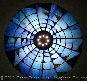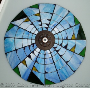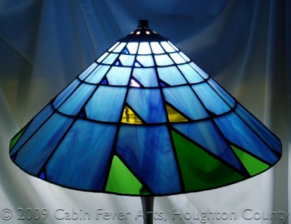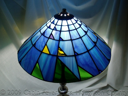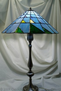 This lamp has a 16" diameter lampshade featuring an artistic interpretation of Pascal's triangle. The piece is made with colorful shades of opalescent blue, royal blue, purple, yellow, and two shades of green. The color and size of the glass triangles correspond to a number in Pascal's triangle, a geometric arrangement of the binomial coefficients. As glass changes in the light, many photos are taken under different lighting scenarios. Each piece is cut, foiled, soldered and then finished in a black patina, followed by waxing and buffing to a shine.