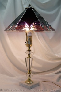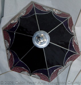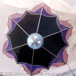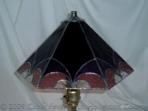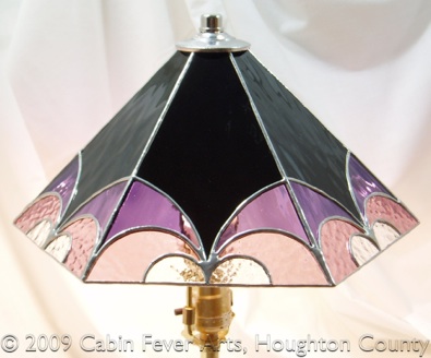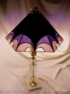 This stained glass lamp is approximately 20" tall on its stand with a 12" diameter shade. This piece is made with vibrant shades of purple, pink, crystal clear and black waterglass. As glass changes in the light, many photos are taken under different lighting scenarios. Each piece is cut, ground, foiled, soldered and then finished by waxing and buffing to a shine.